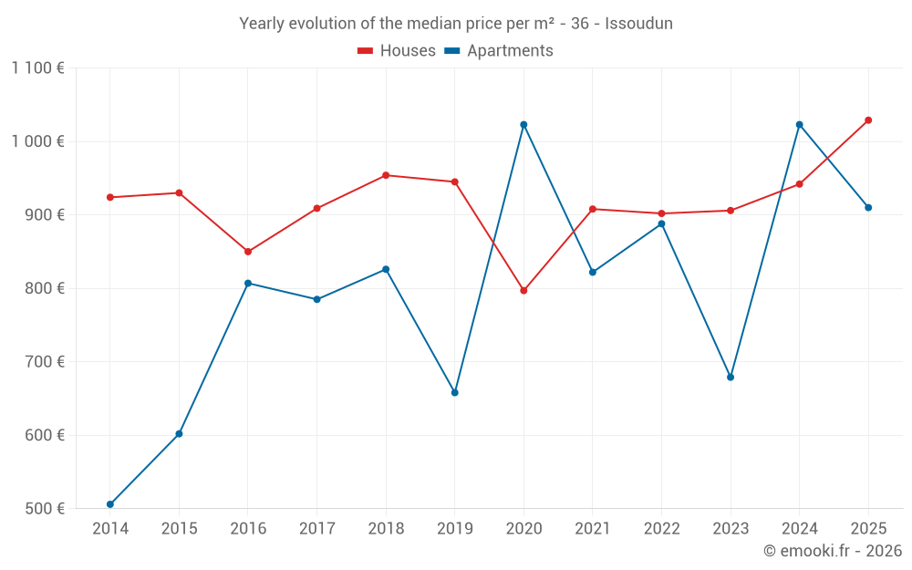 The median price on the 23 apartment transactions of the last 24 months in the municipality of Issoudun was 877 € per square meter for a median property value of 77 500 €. Over this period, 60% of transactions were between 599 and 1 265 € per square meter (from the 2nd to the 8th deciles).