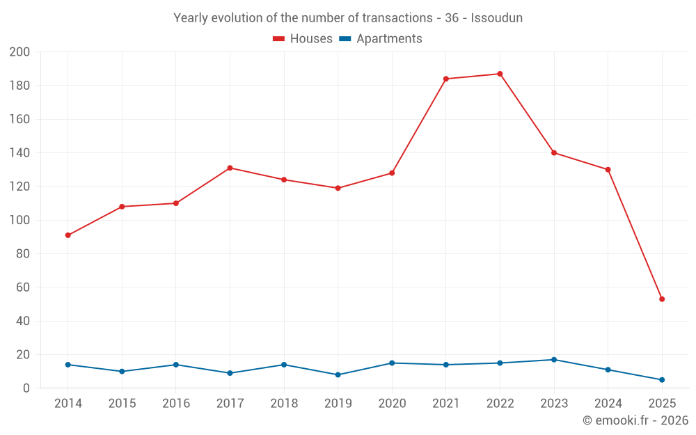 The median price on the 26 house transactions of the last 3 months in the municipality of Issoudun was 1 048 € per square meter for a median property value of 88 500 €. Over this period, 60% of transactions were between 723 and 1 585 € per square meter (from the 2nd to the 8th deciles).