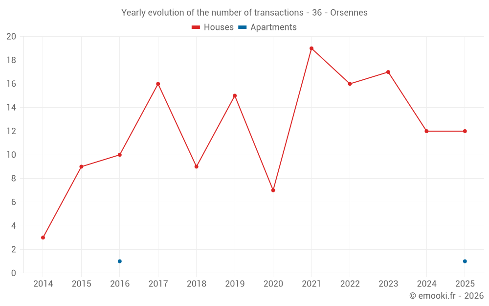The median price on the 24 house transactions of the last 24 months in the municipality of Orsennes was 417 € per square meter for a median property value of 42 593 €. Over this period, 60% of transactions were between 261 and 809 € per square meter (from the 2nd to the 8th deciles).