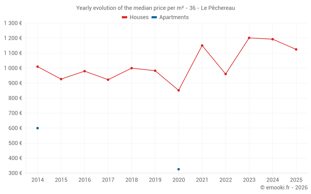 The median price on the 20 house transactions of the last 12 months in the municipality of Le Pêchereau was 1 238 € per square meter for a median property value of 99 000 €. Over this period, 60% of transactions were between 1 043 and 1 589 € per square meter (from the 2nd to the 8th deciles).