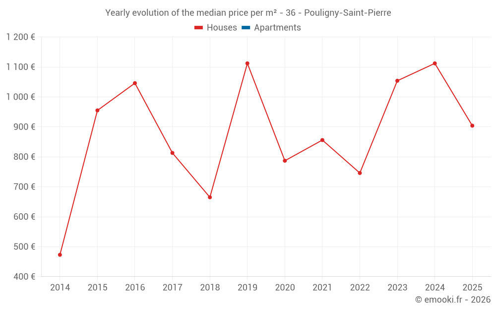 The median price on the 27 house transactions of the last 24 months in the municipality of Pouligny-Saint-Pierre was 1 133 € per square meter for a median property value of 80 000 €. Over this period, 60% of transactions were between 679 and 1 409 € per square meter (from the 2nd to the 8th deciles).