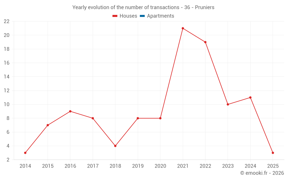 The median price on the 19 house transactions of the last 24 months in the municipality of Pruniers was 707 € per square meter for a median property value of 59 500 €. Over this period, 60% of transactions were between 453 and 1 018 € per square meter (from the 2nd to the 8th deciles).
