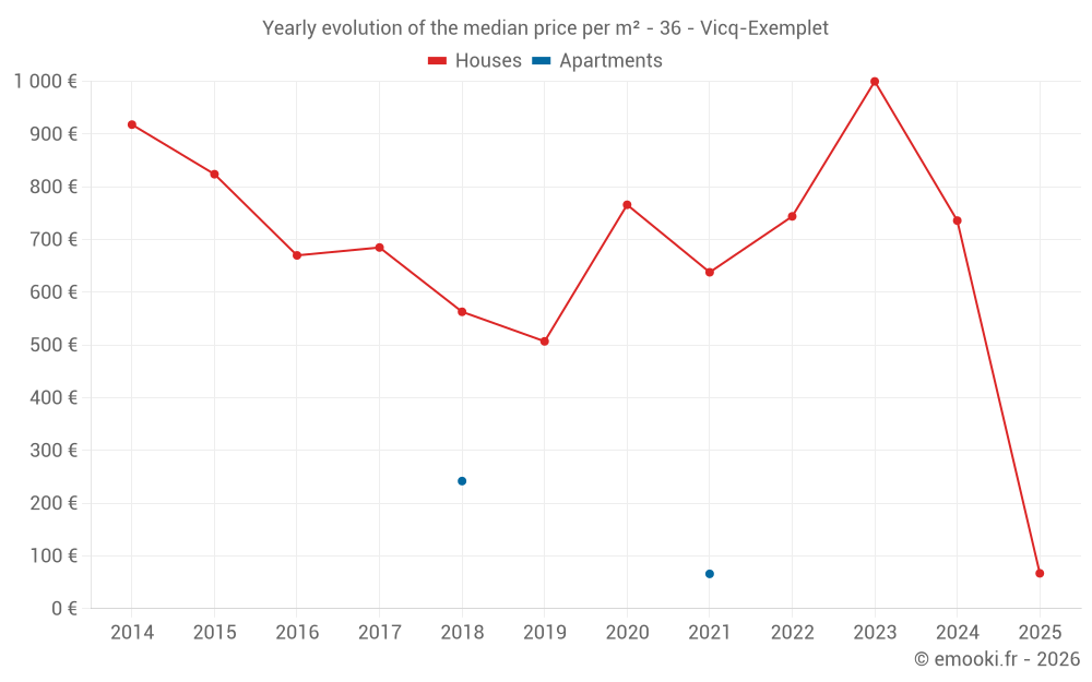 The median price on the 18 house transactions of the last 24 months in the municipality of Vicq-Exemplet was 735 € per square meter for a median property value of 65 150 €. Over this period, 60% of transactions were between 562 and 1 087 € per square meter (from the 2nd to the 8th deciles).