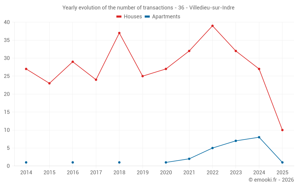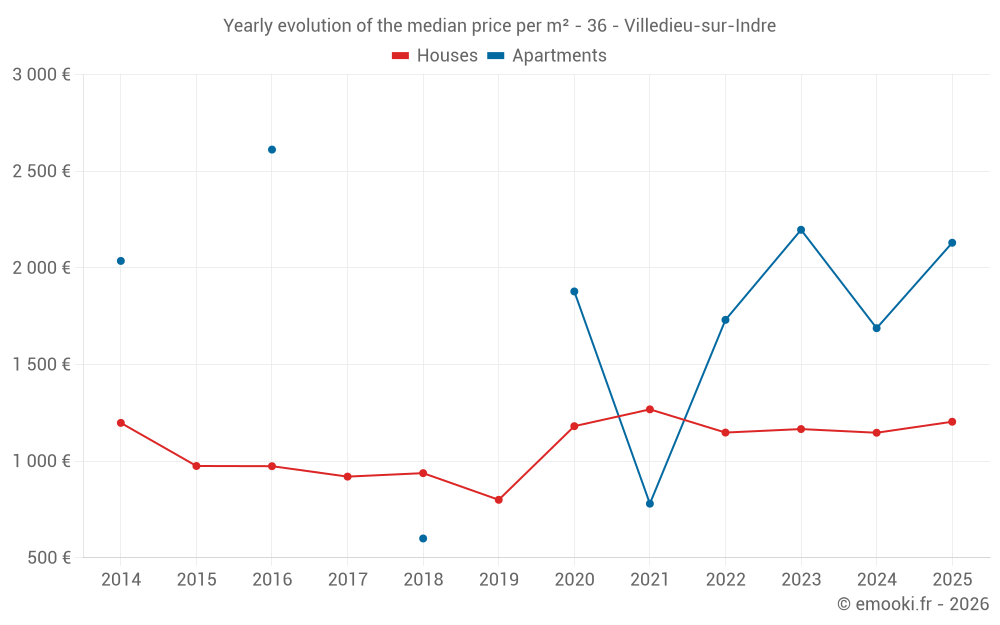 The median price on the 26 house transactions of the last 12 months in the municipality of Villedieu-sur-Indre was 1 204 € per square meter for a median property value of 89 250 €. Over this period, 60% of transactions were between 835 and 1 472 € per square meter (from the 2nd to the 8th deciles).