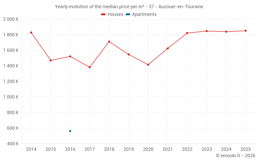 The median price on the 21 house transactions of the last 12 months in the municipality of Auzouer-en-Touraine was 1 818 € per square meter for a median property value of 176 000 €. Over this period, 60% of transactions were between 1 444 and 2 041 € per square meter (from the 2nd to the 8th deciles).