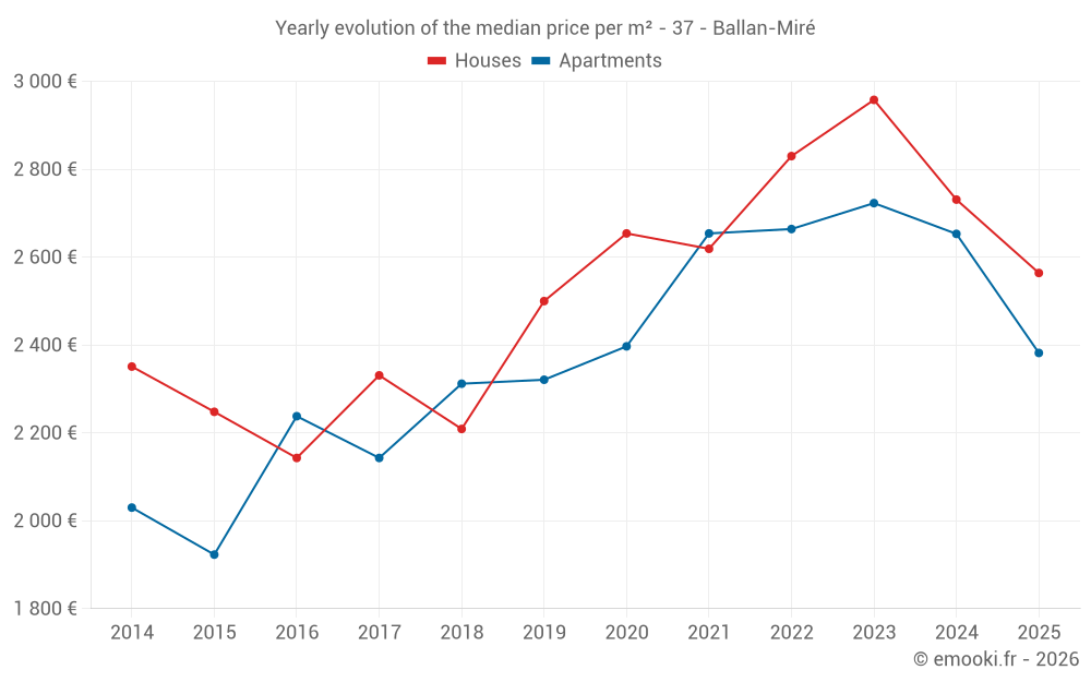 The median price on the 30 apartment transactions of the last 24 months in the municipality of Ballan-Miré was 2 629 € per square meter for a median property value of 167 500 €. Over this period, 60% of transactions were between 2 281 and 2 880 € per square meter (from the 2nd to the 8th deciles).