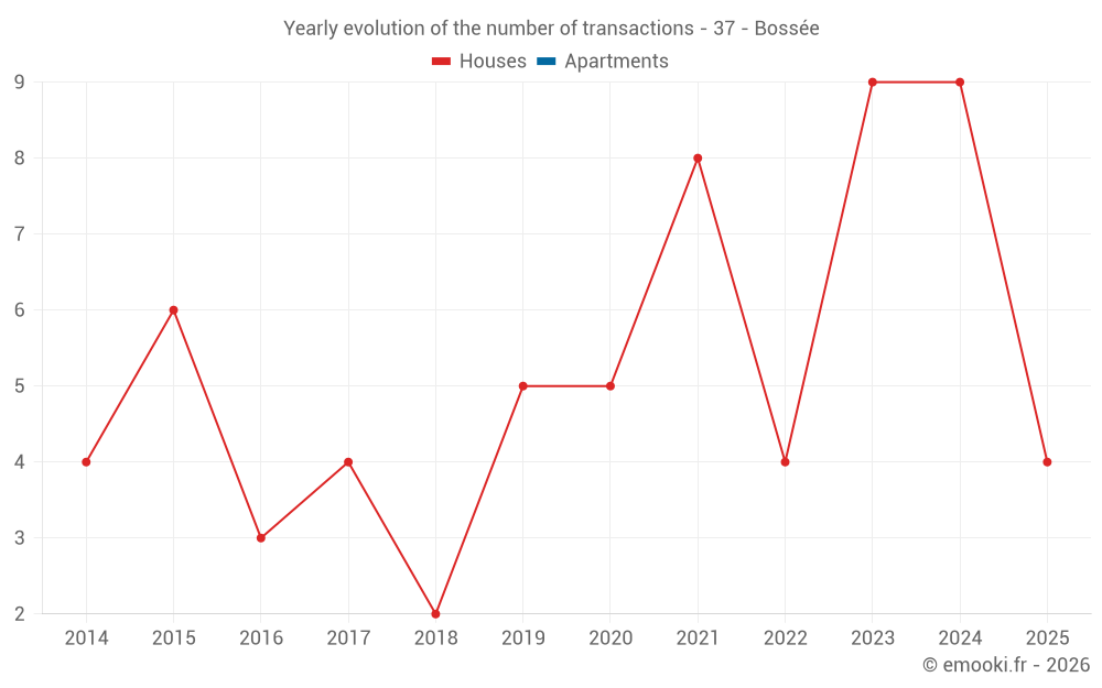 The median price on the 20 house transactions of the last 24 months in the municipality of Bossée was 1 424 € per square meter for a median property value of 115 500 €. Over this period, 60% of transactions were between 635 and 1 700 € per square meter (from the 2nd to the 8th deciles).