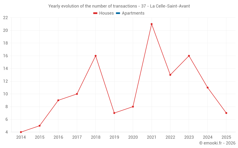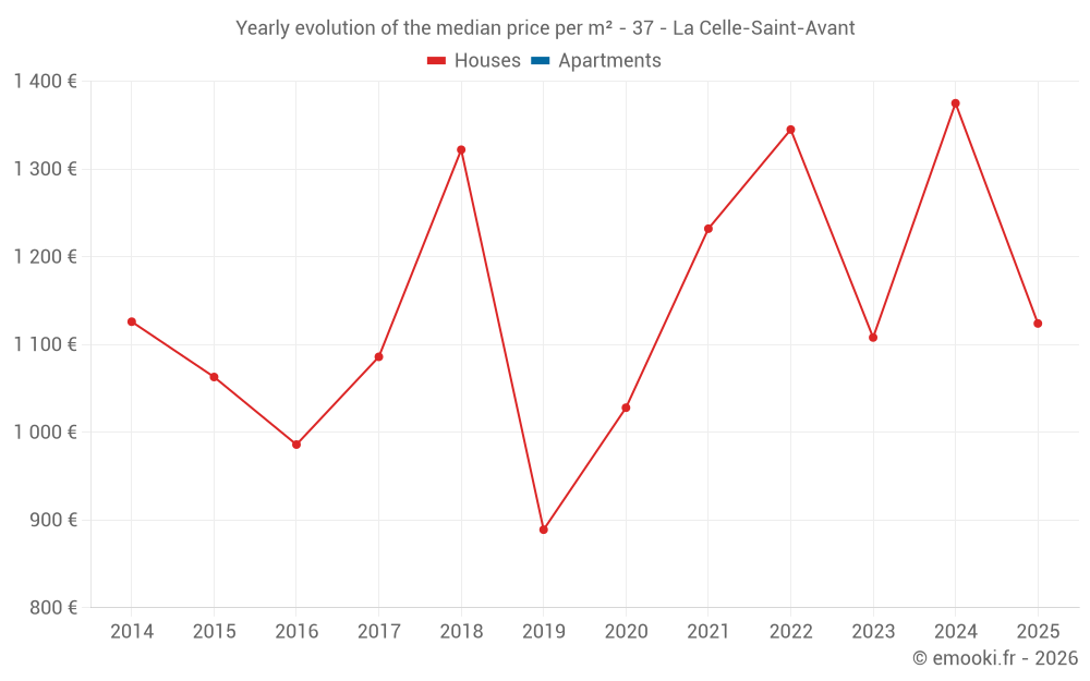 The median price on the 28 house transactions of the last 24 months in the municipality of La Celle-Saint-Avant was 1 199 € per square meter for a median property value of 121 500 €. Over this period, 60% of transactions were between 881 and 1 484 € per square meter (from the 2nd to the 8th deciles).