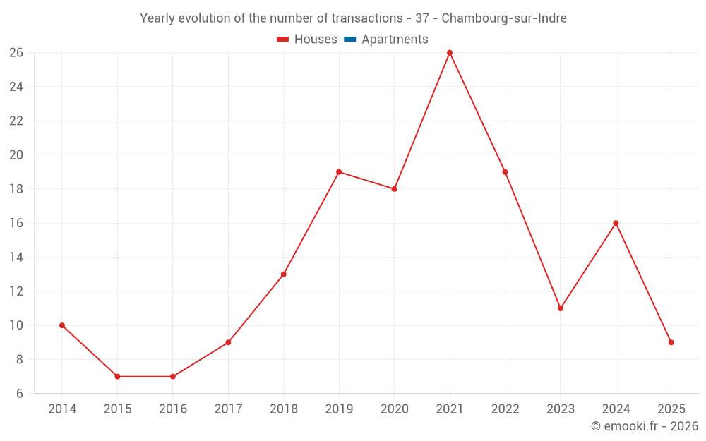 The median price on the 17 house transactions of the last 12 months in the municipality of Chambourg-sur-Indre was 1 923 € per square meter for a median property value of 165 000 €. Over this period, 60% of transactions were between 1 373 and 2 233 € per square meter (from the 2nd to the 8th deciles).