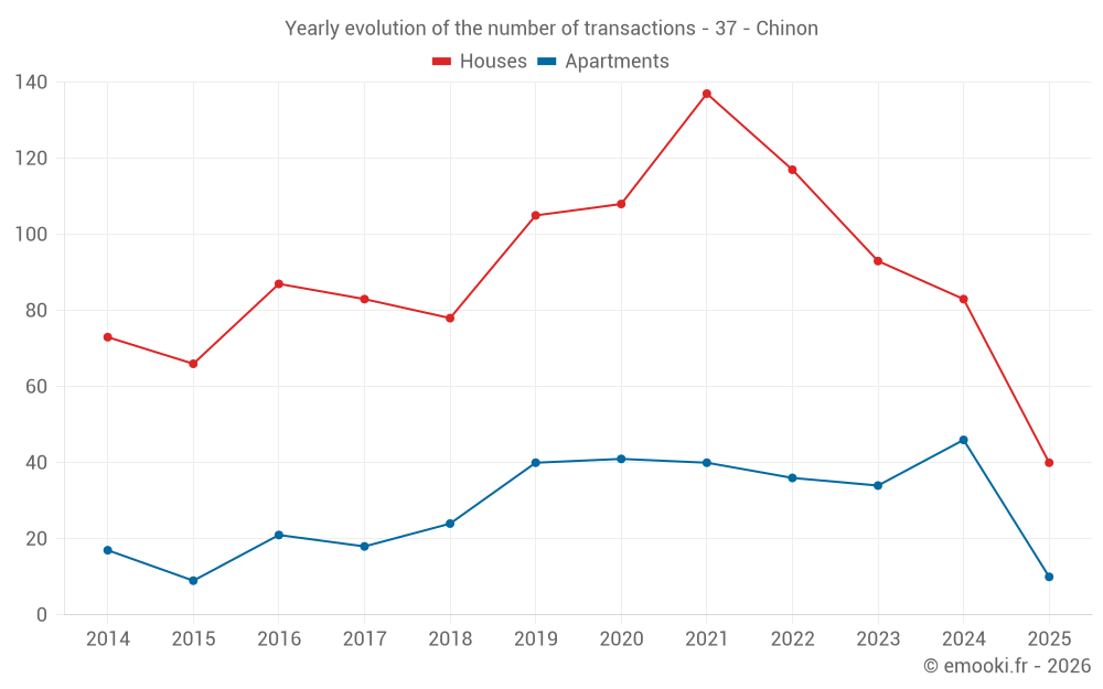 The median price on the 22 house transactions of the last 3 months in the municipality of Chinon was 1 612 € per square meter for a median property value of 151 816 €. Over this period, 60% of transactions were between 1 108 and 1 894 € per square meter (from the 2nd to the 8th deciles).