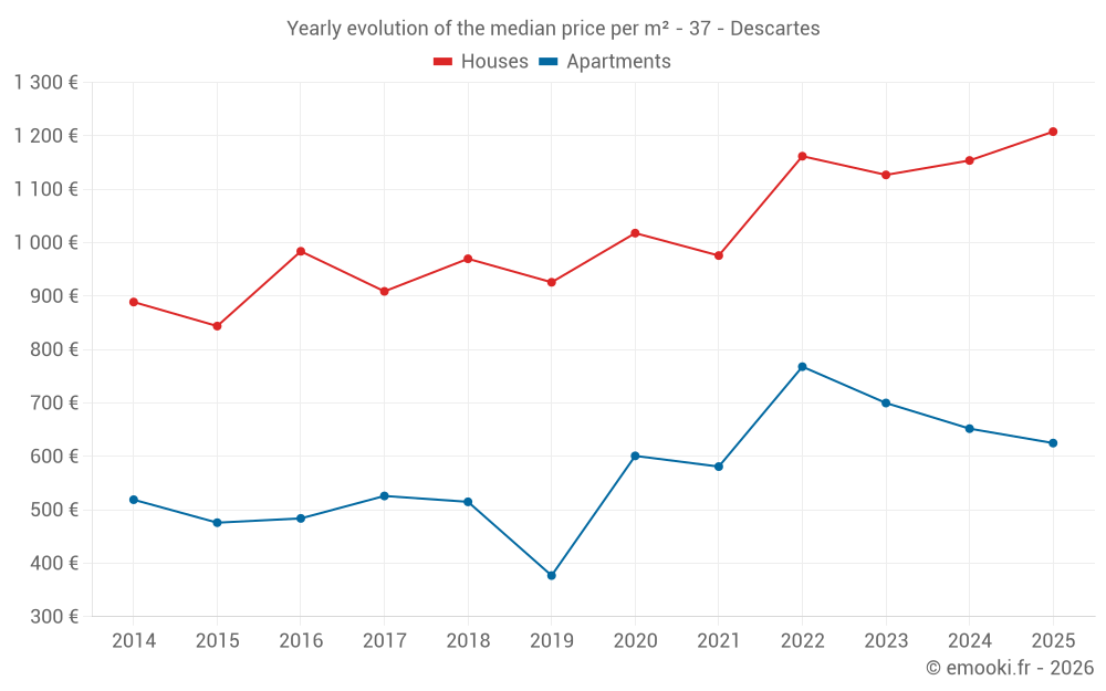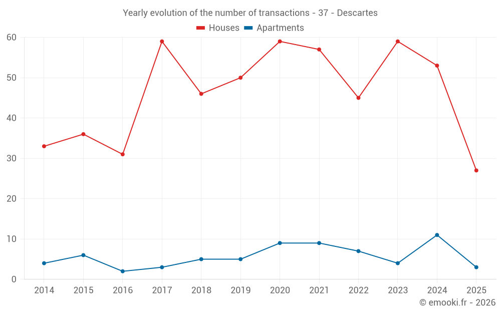 The median price on the 15 apartment transactions of the last 24 months in the municipality of Descartes was 650 € per square meter for a median property value of 44 850 €. Over this period, 60% of transactions were between 600 and 733 € per square meter (from the 2nd to the 8th deciles).