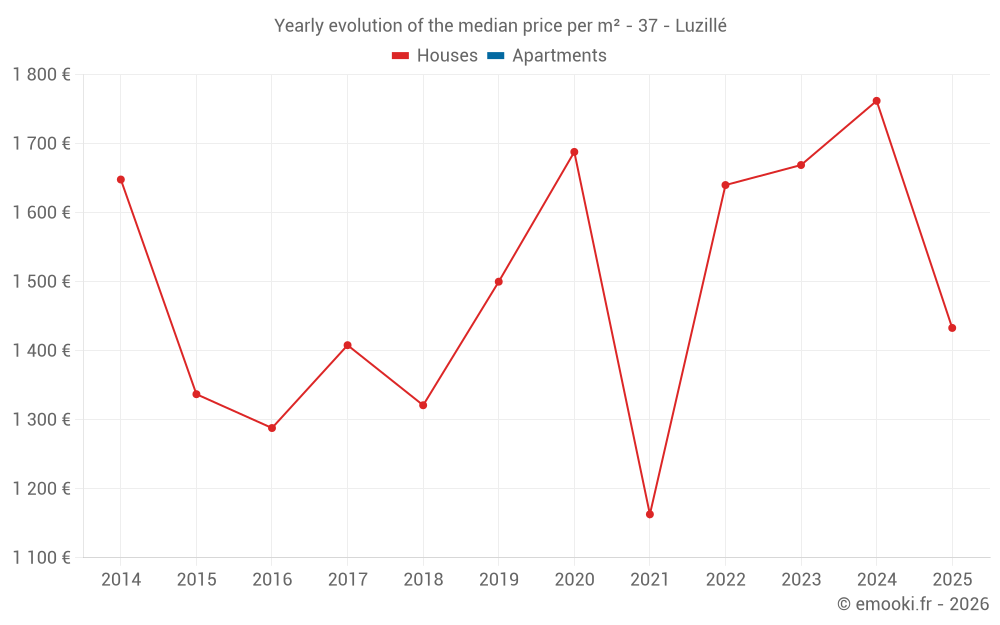 The median price on the 22 house transactions of the last 24 months in the municipality of Luzillé was 1 653 € per square meter for a median property value of 169 202 €. Over this period, 60% of transactions were between 1 237 and 2 334 € per square meter (from the 2nd to the 8th deciles).