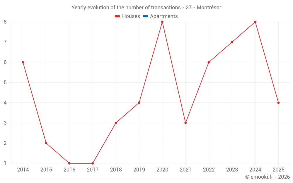 The median price on the 17 house transactions of the last 24 months in the municipality of Montrésor was 1 337 € per square meter for a median property value of 98 000 €. Over this period, 60% of transactions were between 876 and 1 930 € per square meter (from the 2nd to the 8th deciles).