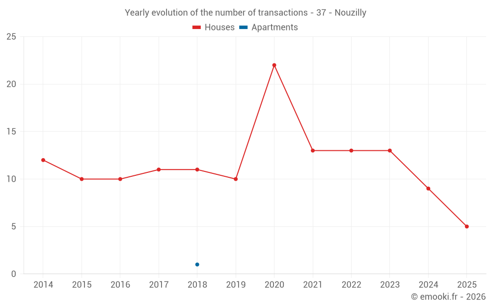 The median price on the 19 house transactions of the last 24 months in the municipality of Nouzilly was 2 209 € per square meter for a median property value of 200 000 €. Over this period, 60% of transactions were between 1 646 and 2 632 € per square meter (from the 2nd to the 8th deciles).