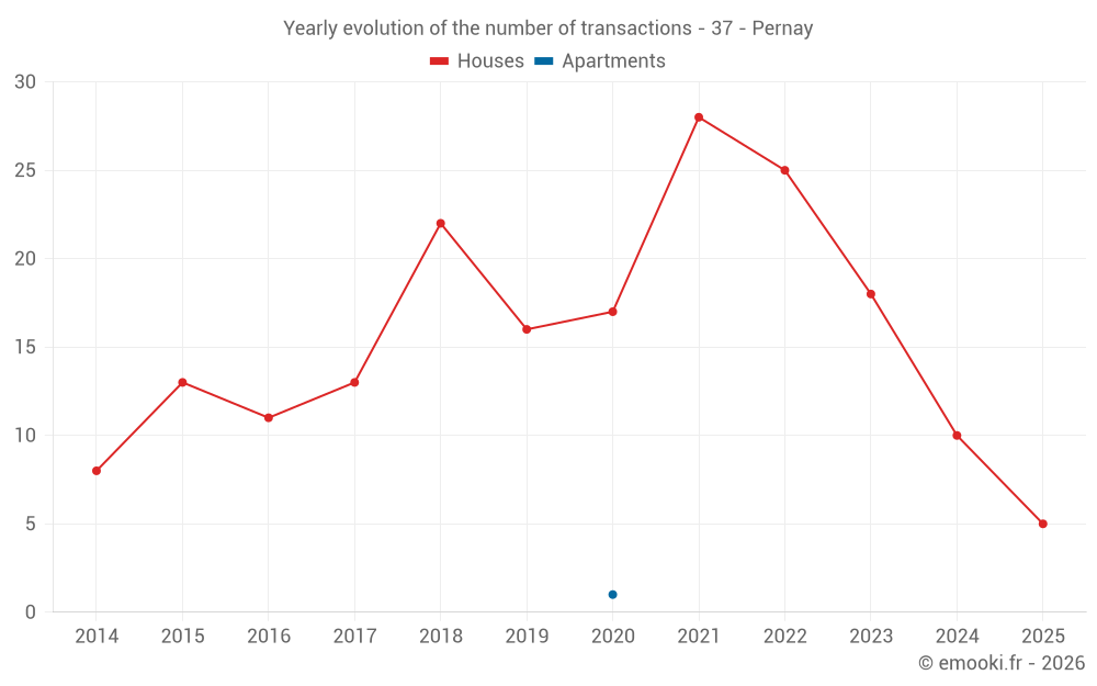 The median price on the 24 house transactions of the last 24 months in the municipality of Pernay was 2 284 € per square meter for a median property value of 242 500 €. Over this period, 60% of transactions were between 1 972 and 2 977 € per square meter (from the 2nd to the 8th deciles).