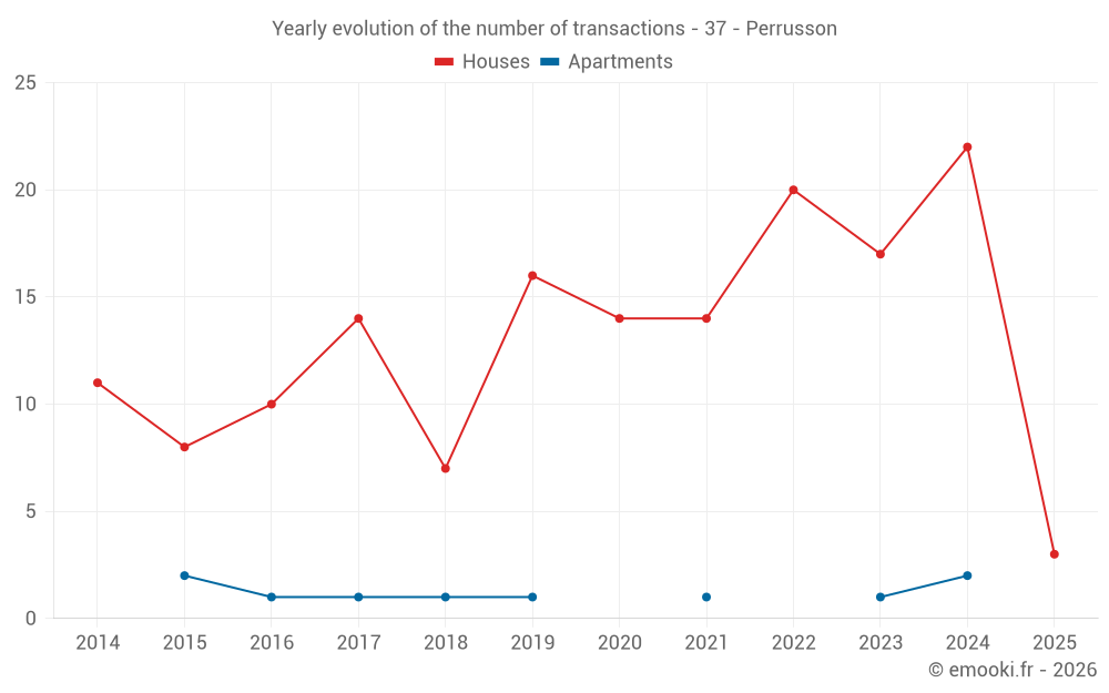 The median price on the 38 house transactions of the last 24 months in the municipality of Perrusson was 1 612 € per square meter for a median property value of 157 250 €. Over this period, 60% of transactions were between 1 104 and 1 992 € per square meter (from the 2nd to the 8th deciles).