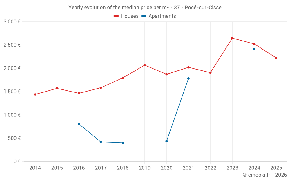 The median price on the 22 house transactions of the last 24 months in the municipality of Pocé-sur-Cisse was 2 612 € per square meter for a median property value of 202 000 €. Over this period, 60% of transactions were between 1 783 and 2 989 € per square meter (from the 2nd to the 8th deciles).