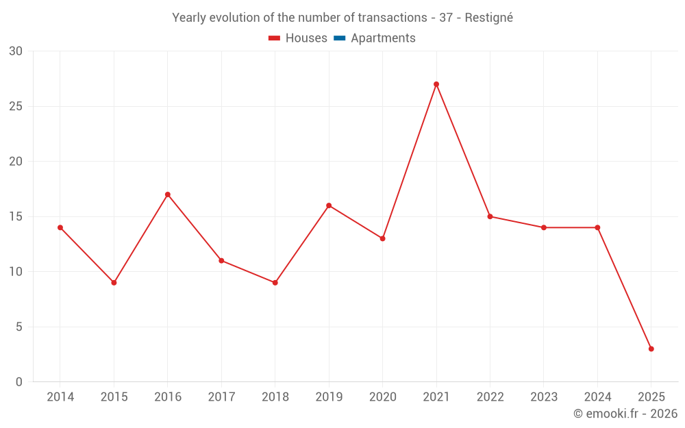 The median price on the 25 house transactions of the last 24 months in the municipality of Restigné was 1 533 € per square meter for a median property value of 210 000 €. Over this period, 60% of transactions were between 1 326 and 2 383 € per square meter (from the 2nd to the 8th deciles).