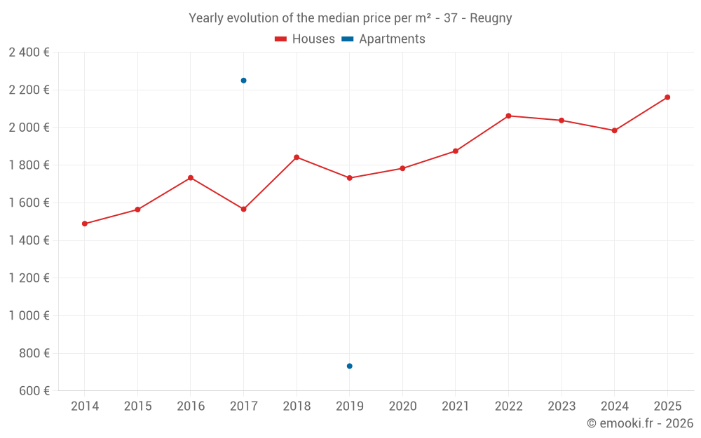 The median price on the 33 house transactions of the last 24 months in the municipality of Reugny was 2 029 € per square meter for a median property value of 190 710 €. Over this period, 60% of transactions were between 1 638 and 2 392 € per square meter (from the 2nd to the 8th deciles).