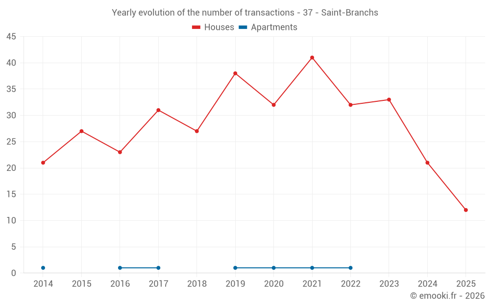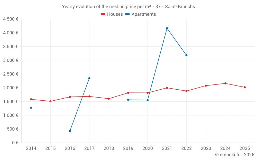 The median price on the 28 house transactions of the last 12 months in the municipality of Saint-Branchs was 2 114 € per square meter for a median property value of 179 500 €. Over this period, 60% of transactions were between 1 669 and 2 603 € per square meter (from the 2nd to the 8th deciles).