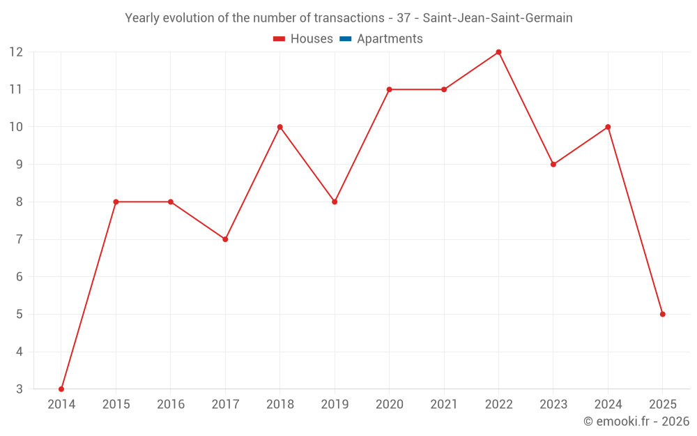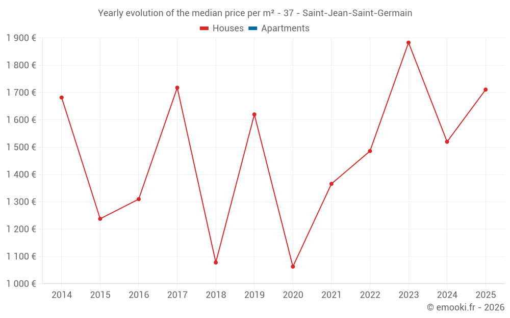 The median price on the 20 house transactions of the last 24 months in the municipality of Saint-Jean-Saint-Germain was 1 544 € per square meter for a median property value of 130 000 €. Over this period, 60% of transactions were between 560 and 1 781 € per square meter (from the 2nd to the 8th deciles).