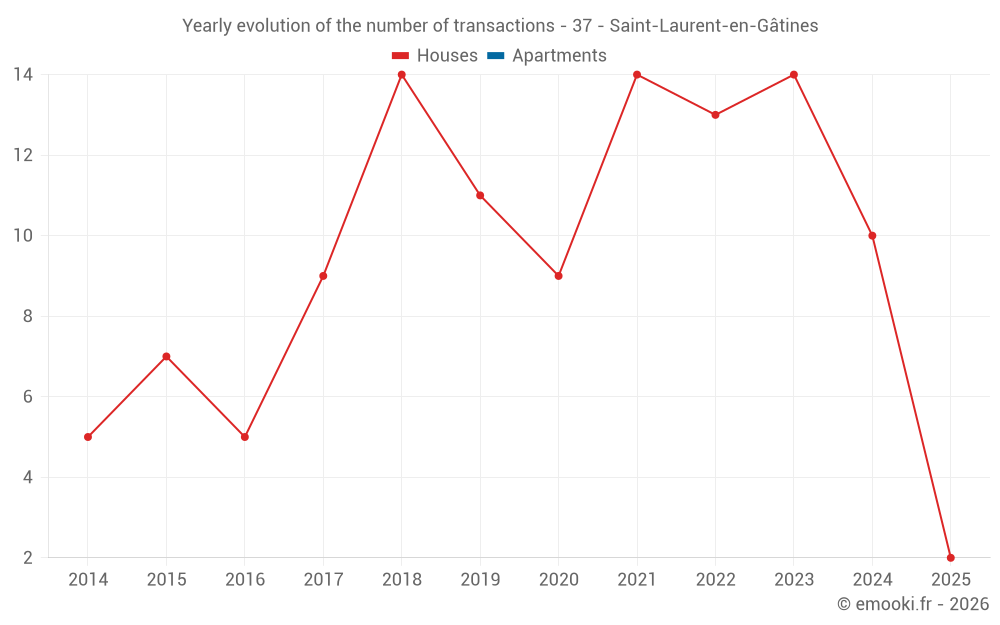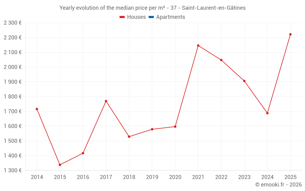 The median price on the 19 house transactions of the last 24 months in the municipality of Saint-Laurent-en-Gâtines was 1 828 € per square meter for a median property value of 170 000 €. Over this period, 60% of transactions were between 1 424 and 2 311 € per square meter (from the 2nd to the 8th deciles).
