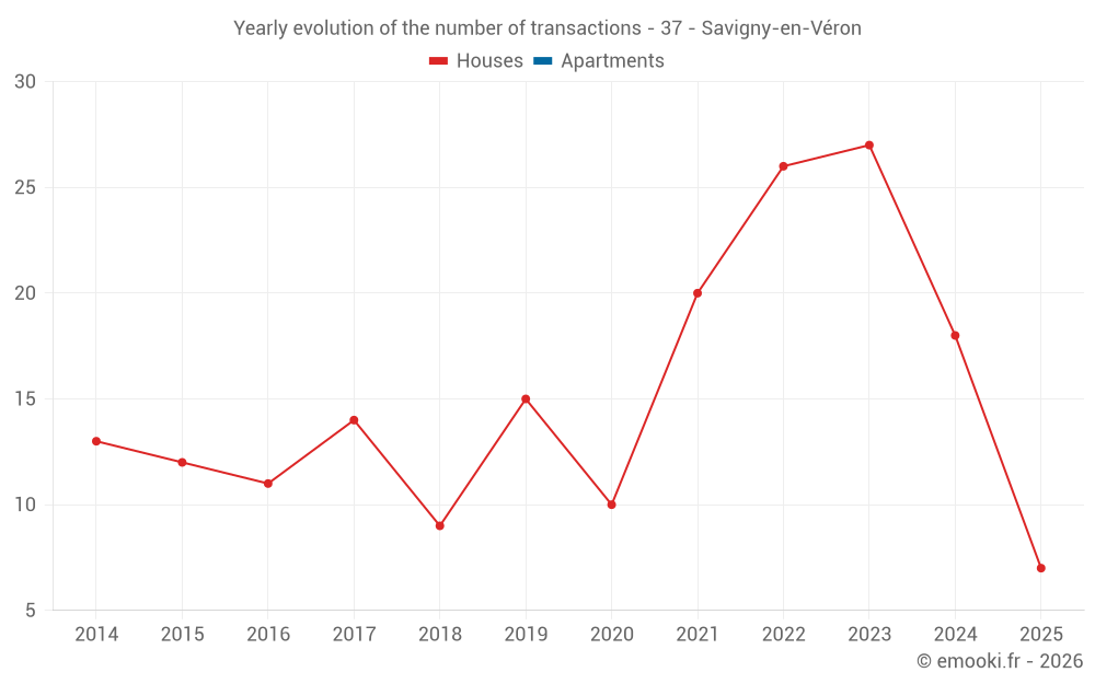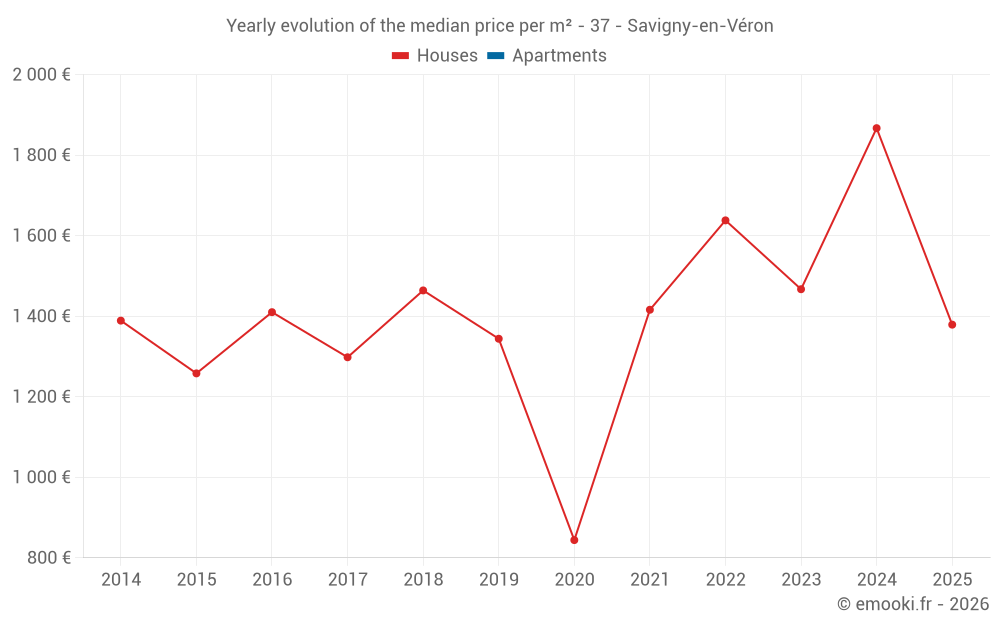 The median price on the 16 house transactions of the last 12 months in the municipality of Savigny-en-Véron was 1 628 € per square meter for a median property value of 151 500 €. Over this period, 60% of transactions were between 1 379 and 1 923 € per square meter (from the 2nd to the 8th deciles).
