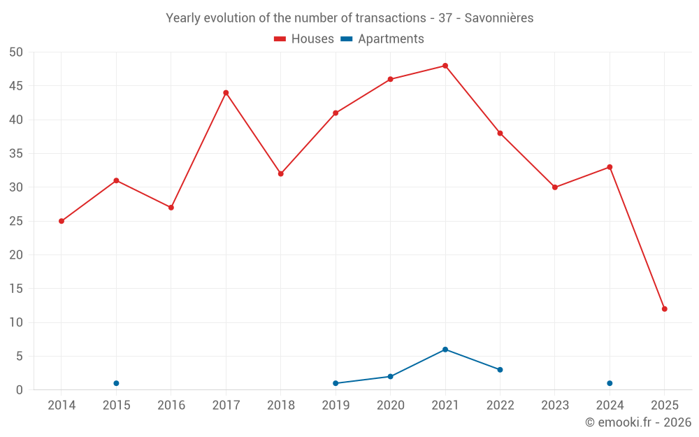 The median price on the 30 house transactions of the last 12 months in the municipality of Savonnières was 2 660 € per square meter for a median property value of 226 500 €. Over this period, 60% of transactions were between 1 234 and 3 198 € per square meter (from the 2nd to the 8th deciles).
