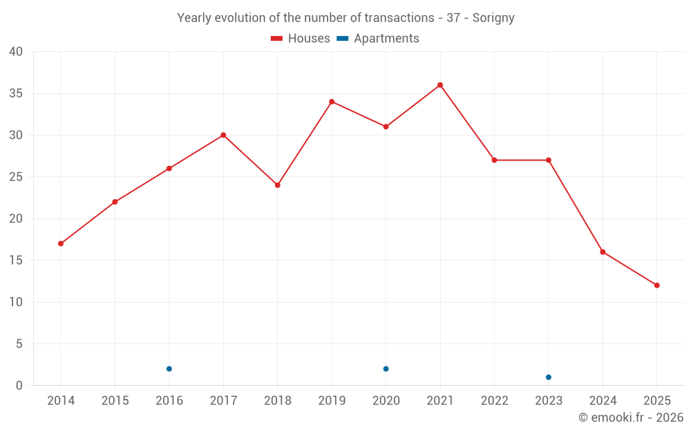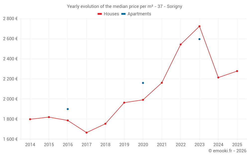 The median price on the 22 house transactions of the last 12 months in the municipality of Sorigny was 2 333 € per square meter for a median property value of 250 000 €. Over this period, 60% of transactions were between 1 823 and 2 915 € per square meter (from the 2nd to the 8th deciles).
