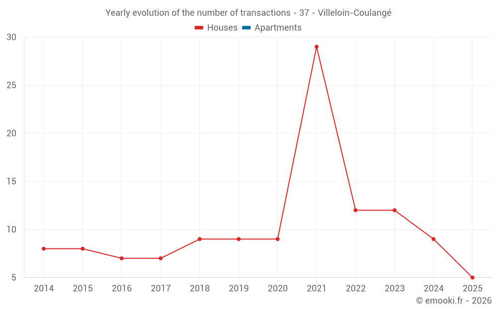 The median price on the 20 house transactions of the last 24 months in the municipality of Villeloin-Coulangé was 1 120 € per square meter for a median property value of 141 000 €. Over this period, 60% of transactions were between 747 and 1 470 € per square meter (from the 2nd to the 8th deciles).