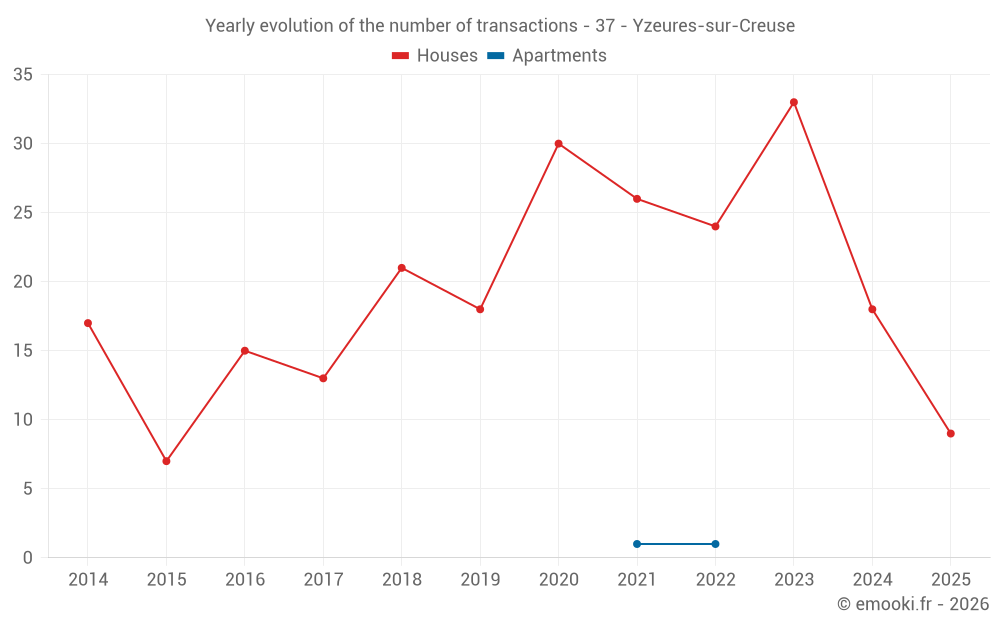 The median price on the 19 house transactions of the last 12 months in the municipality of Yzeures-sur-Creuse was 923 € per square meter for a median property value of 65 108 €. Over this period, 60% of transactions were between 466 and 1 310 € per square meter (from the 2nd to the 8th deciles).