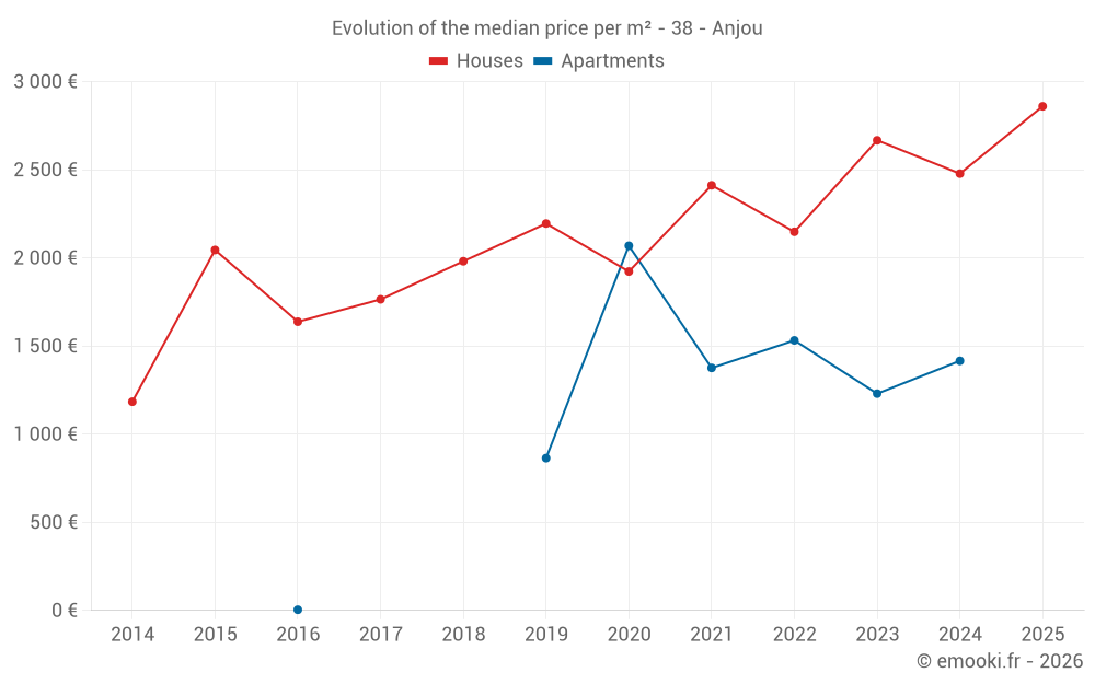 The median price on the 18 house transactions of the last 24 months in the municipality of Anjou was 2 692 € per square meter for a median property value of 234 160 €. Over this period, 60% of transactions were between 1 695 and 2 972 € per square meter (from the 2nd to the 8th deciles).
