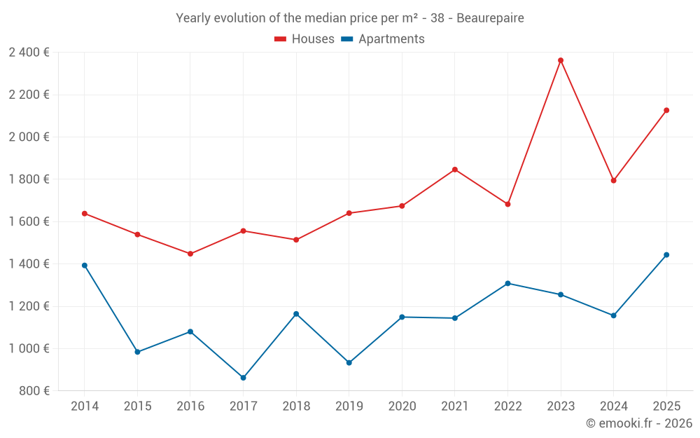 The median price on the 22 apartment transactions of the last 12 months in the municipality of Beaurepaire was 1 391 € per square meter for a median property value of 94 500 €. Over this period, 60% of transactions were between 894 and 1 766 € per square meter (from the 2nd to the 8th deciles).