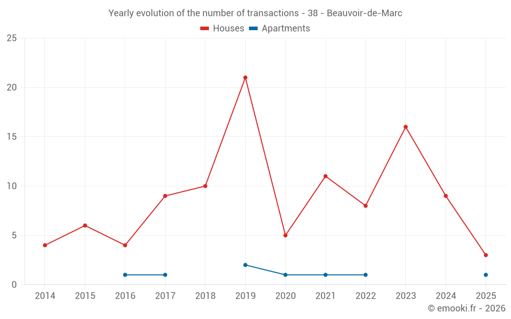 The median price on the 20 house transactions of the last 24 months in the municipality of Beauvoir-de-Marc was 2 736 € per square meter for a median property value of 280 075 €. Over this period, 60% of transactions were between 1 642 and 3 207 € per square meter (from the 2nd to the 8th deciles).