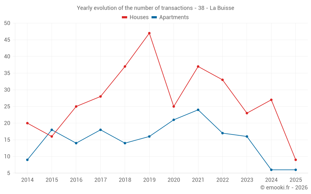 The median price on the 22 house transactions of the last 12 months in the municipality of La Buisse was 3 000 € per square meter for a median property value of 291 650 €. Over this period, 60% of transactions were between 1 626 and 4 137 € per square meter (from the 2nd to the 8th deciles).