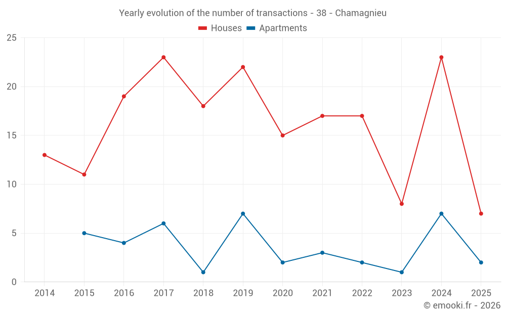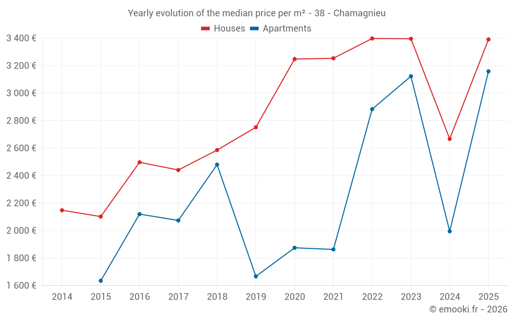 The median price on the 18 house transactions of the last 12 months in the municipality of Chamagnieu was 2 850 € per square meter for a median property value of 354 500 €. Over this period, 60% of transactions were between 2 004 and 3 477 € per square meter (from the 2nd to the 8th deciles).