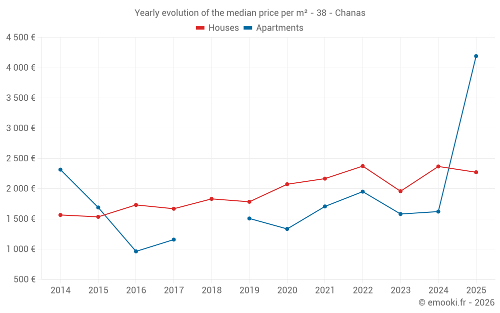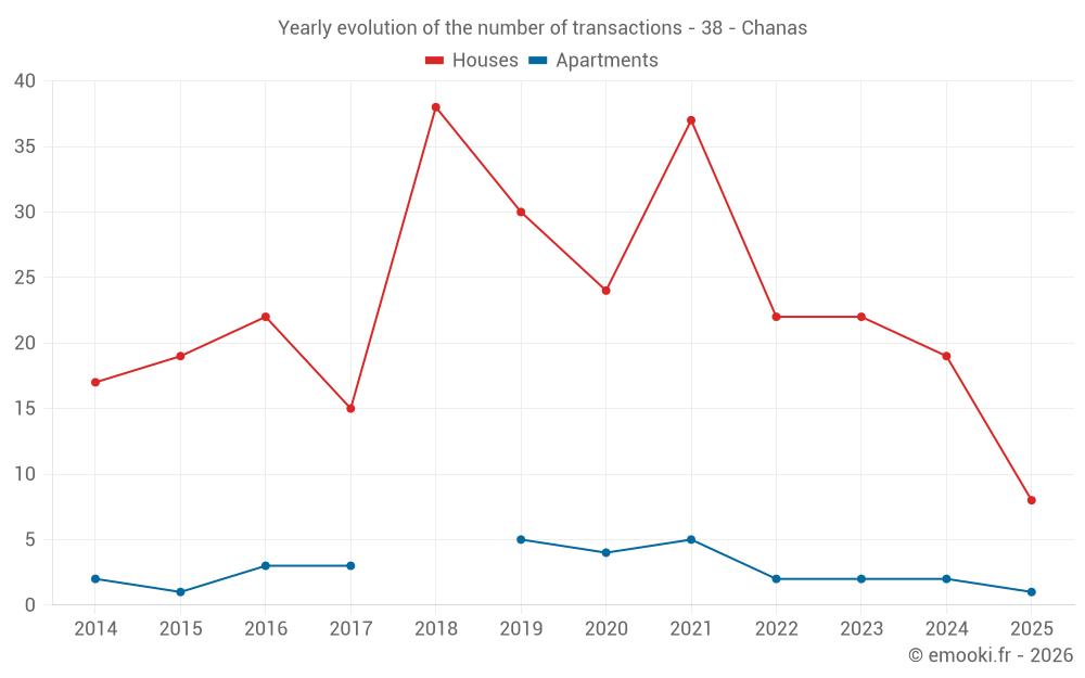 The median price on the 21 house transactions of the last 12 months in the municipality of Chanas was 2 271 € per square meter for a median property value of 212 000 €. Over this period, 60% of transactions were between 1 890 and 2 761 € per square meter (from the 2nd to the 8th deciles).