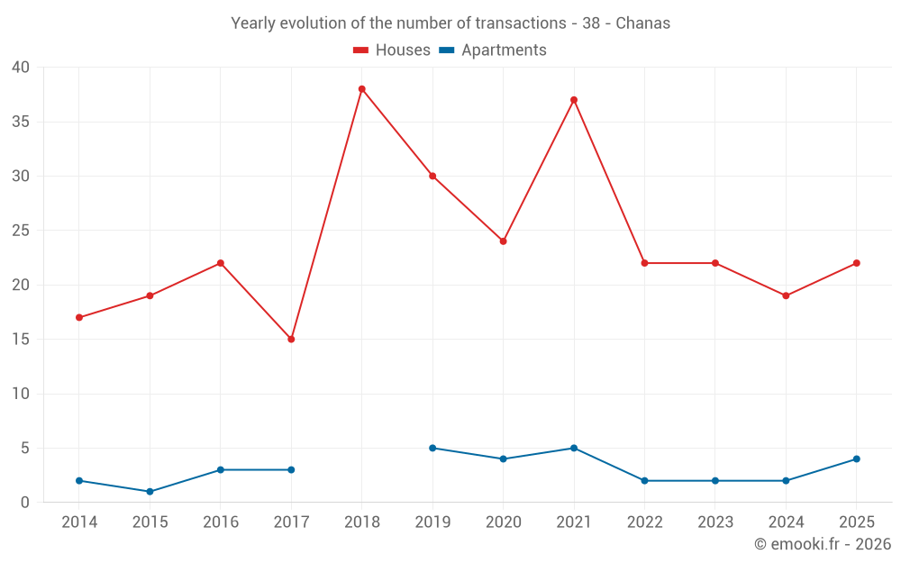 The median price on the 22 house transactions of the last 12 months in the municipality of Chanas was 2 105 € per square meter for a median property value of 205 000 €. Over this period, 60% of transactions were between 1 360 and 2 662 € per square meter (from the 2nd to the 8th deciles).