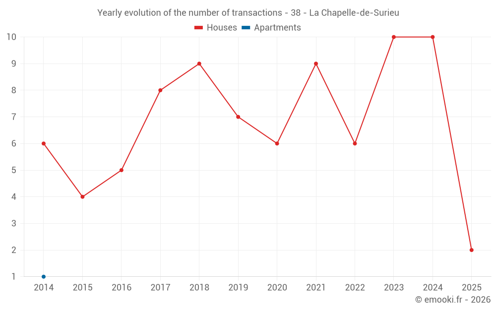 The median price on the 18 house transactions of the last 24 months in the municipality of La Chapelle-de-Surieu was 2 770 € per square meter for a median property value of 270 950 €. Over this period, 60% of transactions were between 1 299 and 3 209 € per square meter (from the 2nd to the 8th deciles).