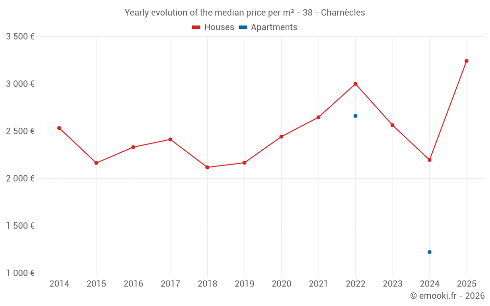 The median price on the 25 house transactions of the last 24 months in the municipality of Charnècles was 2 463 € per square meter for a median property value of 322 450 €. Over this period, 60% of transactions were between 1 711 and 3 121 € per square meter (from the 2nd to the 8th deciles).