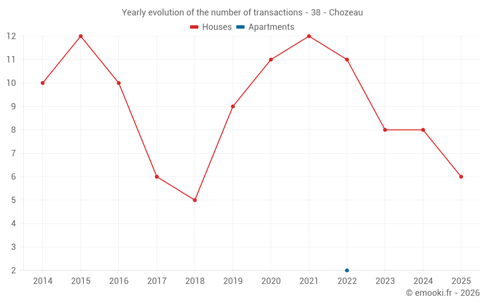 The median price on the 20 house transactions of the last 24 months in the municipality of Chozeau was 2 864 € per square meter for a median property value of 305 500 €. Over this period, 60% of transactions were between 1 806 and 3 638 € per square meter (from the 2nd to the 8th deciles).