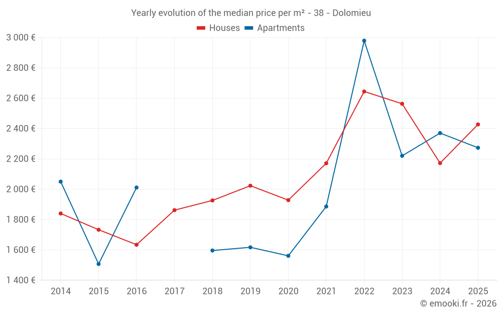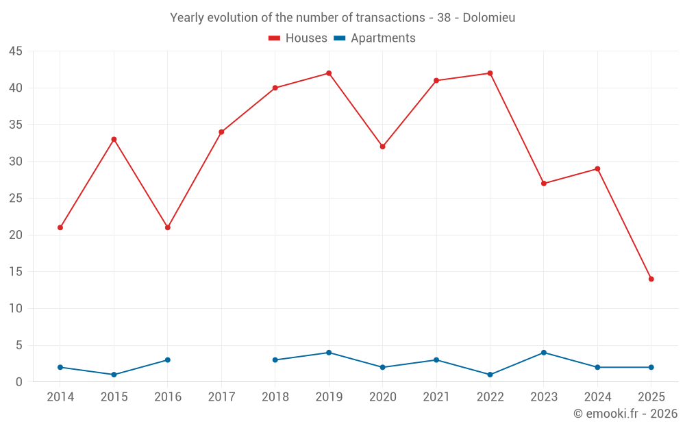 The median price on the 31 house transactions of the last 12 months in the municipality of Dolomieu was 2 167 € per square meter for a median property value of 236 000 €. Over this period, 60% of transactions were between 1 410 and 2 731 € per square meter (from the 2nd to the 8th deciles).