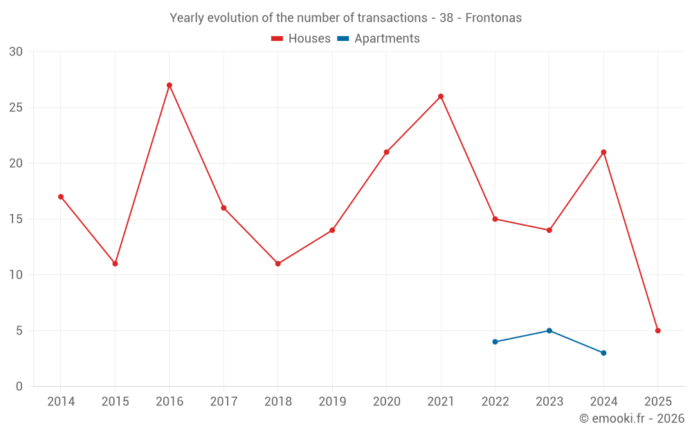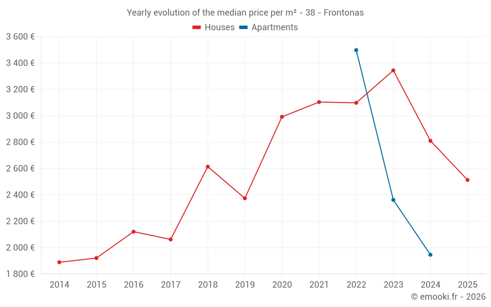 The median price on the 34 house transactions of the last 24 months in the municipality of Frontonas was 2 938 € per square meter for a median property value of 314 655 €. Over this period, 60% of transactions were between 2 141 and 3 547 € per square meter (from the 2nd to the 8th deciles).