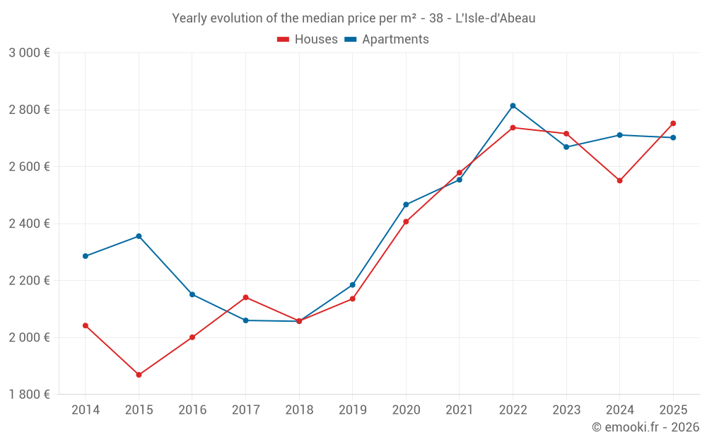 The median price on the 26 house transactions of the last 6 months in the municipality of L'Isle-d'Abeau was 2 752 € per square meter for a median property value of 246 650 €. Over this period, 60% of transactions were between 2 081 and 3 552 € per square meter (from the 2nd to the 8th deciles).
