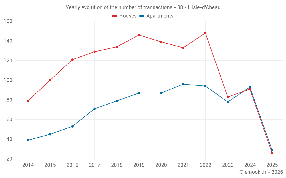 The median price on the 29 apartment transactions of the last 6 months in the municipality of L'Isle-d'Abeau was 2 702 € per square meter for a median property value of 152 000 €. Over this period, 60% of transactions were between 2 166 and 3 151 € per square meter (from the 2nd to the 8th deciles).