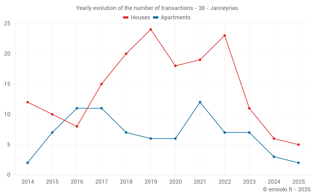 The median price on the 16 house transactions of the last 24 months in the municipality of Janneyrias was 3 480 € per square meter for a median property value of 292 435 €. Over this period, 60% of transactions were between 2 388 and 4 633 € per square meter (from the 2nd to the 8th deciles).