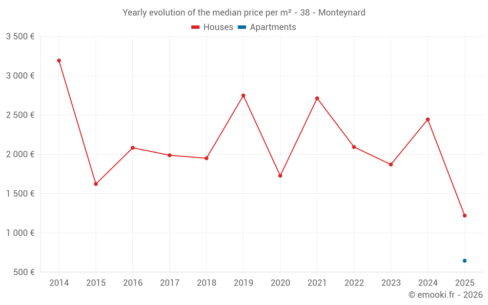 The median price on the 14 house transactions of the last 24 months in the municipality of Monteynard was 1 428 € per square meter for a median property value of 104 000 €. Over this period, 60% of transactions were between 722 and 2 739 € per square meter (from the 2nd to the 8th deciles).