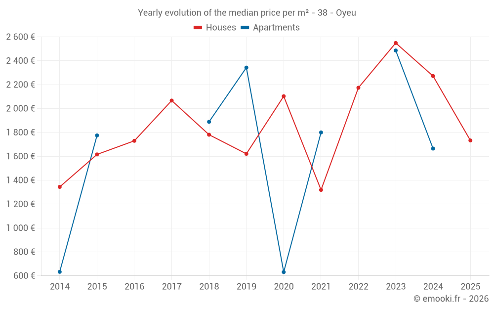 The median price on the 20 house transactions of the last 24 months in the municipality of Oyeu was 2 292 € per square meter for a median property value of 235 925 €. Over this period, 60% of transactions were between 1 824 and 2 613 € per square meter (from the 2nd to the 8th deciles).