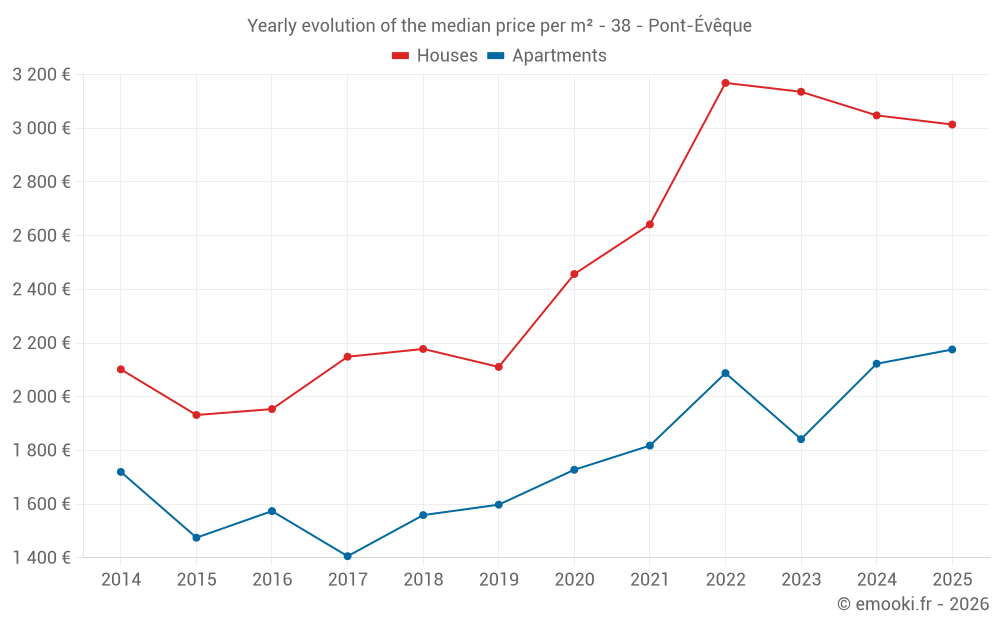 The median price on the 19 house transactions of the last 6 months in the municipality of Pont-Évêque was 3 014 € per square meter for a median property value of 288 200 €. Over this period, 60% of transactions were between 2 782 and 3 434 € per square meter (from the 2nd to the 8th deciles).