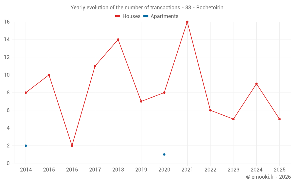The median price on the 17 house transactions of the last 24 months in the municipality of Rochetoirin was 2 329 € per square meter for a median property value of 235 000 €. Over this period, 60% of transactions were between 1 640 and 2 784 € per square meter (from the 2nd to the 8th deciles).